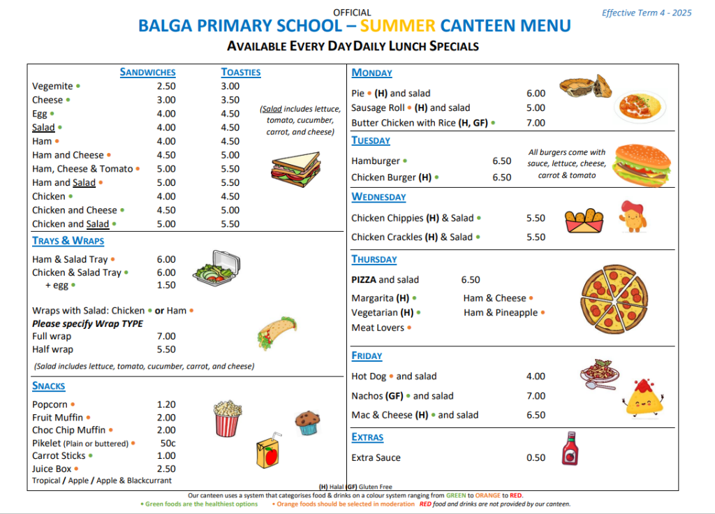 The school offers canteen services through an outside provider from Monday through Friday.